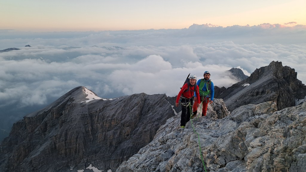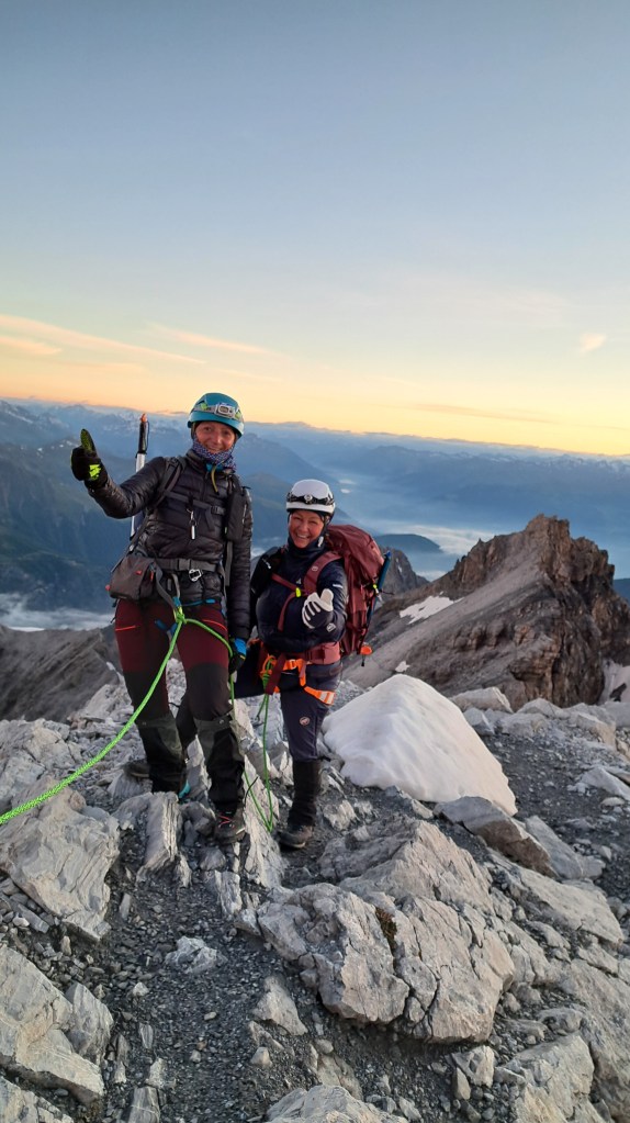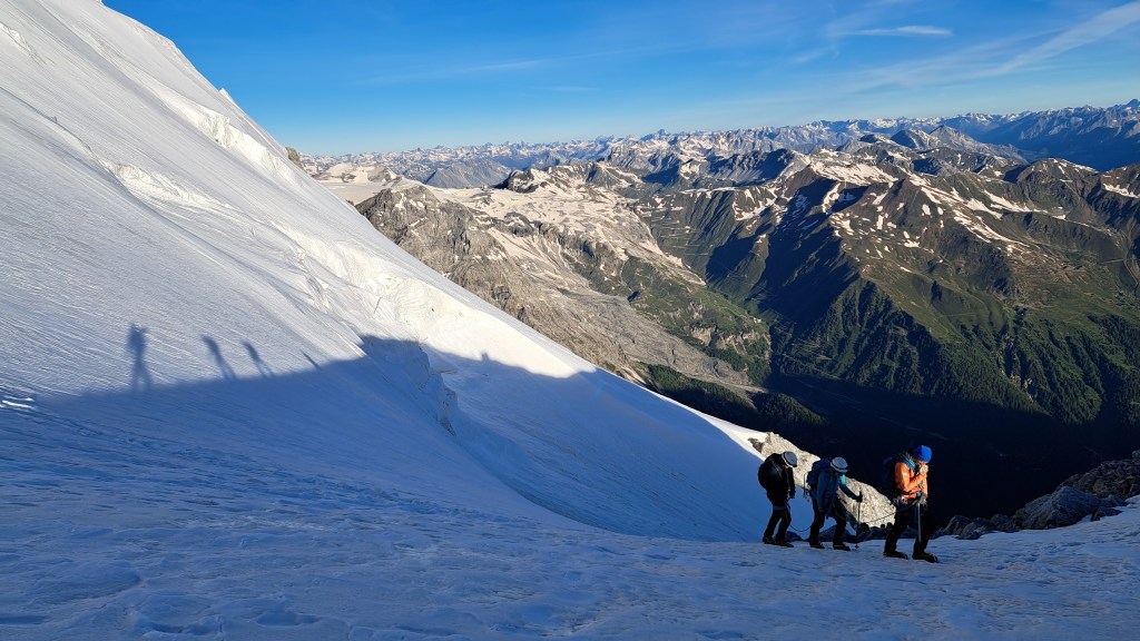 Der Wecker läutet früh zum Frühstück. Wir starten noch im Dunkeln mit unseren Stirnlampen. Der erste Teil verläuft meist über Fels und kurzen Passagen mit Ketten abgesichert. Am Gletscher angekommen steigen wir zwischen Spalten und über zwei Steilstufen zum Gipfel.